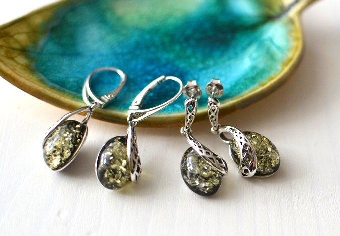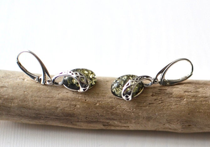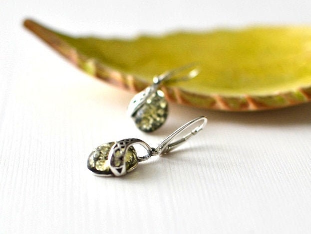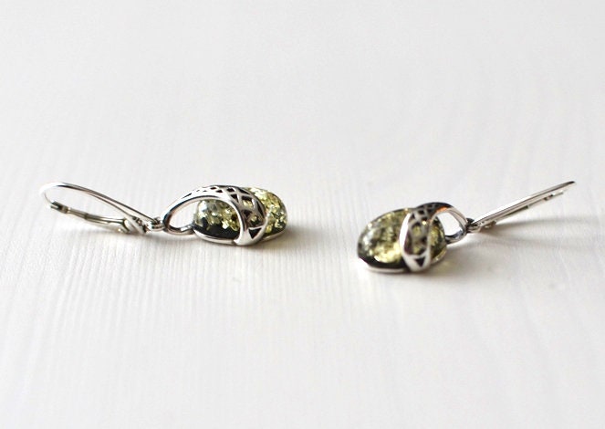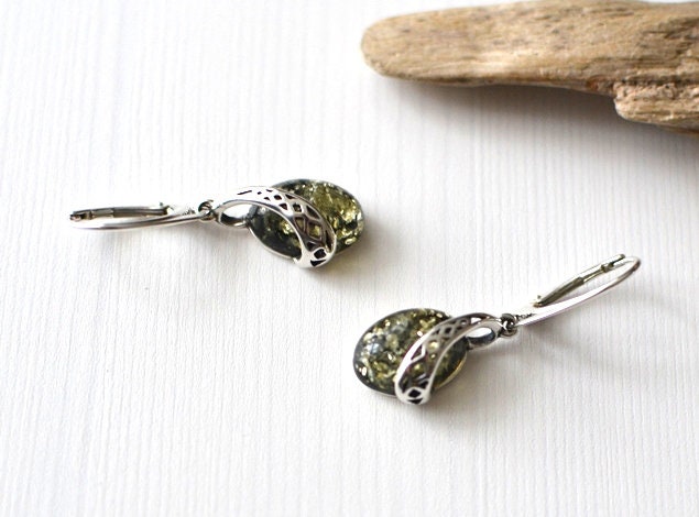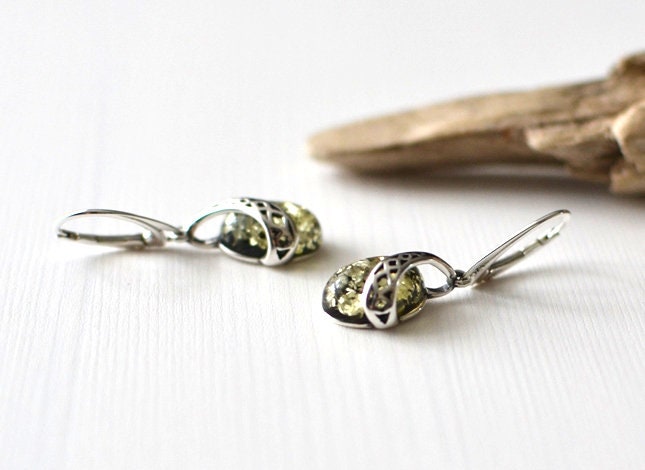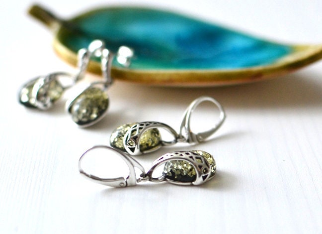 Green dangle Earring, Amber Earrings Green Gemstone Jewelry, drop earrings girlfriend gift, gift for wife, bridesmaid earrings, gift for mom Amber is good to wear for any everyday life occasion Amber earrings made of Baltic stone and sterling silver element (Ag 925). dimensions of stone earrings is about: 38 x 12 mm (1,49 x 0,47"), stone size is about: 14x10 mm (0,55x0,39") net weight: 4.3 g It makes a great set with this necklace: https://www.etsy.com/listing/566332949/green-stone-pendant-stone-necklace?ref=shop_home_active_1 Rich Green Color Exclusive Styling and High Quality Craftsmanship Perfect gift for Mothers Day, Birthdays, Valentines Day, Graduation, Christmas or just about any other occasion. Please remember that all stone pieces are unique! The item you will receive might slightly differ from the one in the photos. If you search for harmony, empowerment and originality offered by nature you must reach for the beautifully handcrafted stone pieces. Baltic Amber is not only known as fine jewelery mineral but is also believed to help improve well being. It has long been recommended as natural remedy for people with respiratory problems and those frequently exposed to stress. Your necklace will come carefully wrapped in an eco-friendly gift box. If you wish to see classical beauty of stone I encourage you to visit our gallery which carries innovative and unique pieces by these Polish artists who often incorporate other exciting elements in their raw and natural form. Please visit our gallery http://www.karuba.eu Thank you for visiting our shop: http://www.etsy.com/shop/KARUBA
