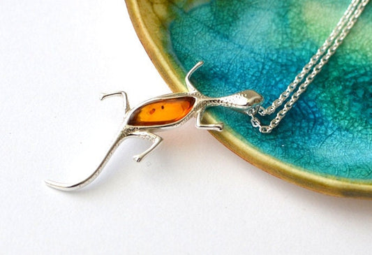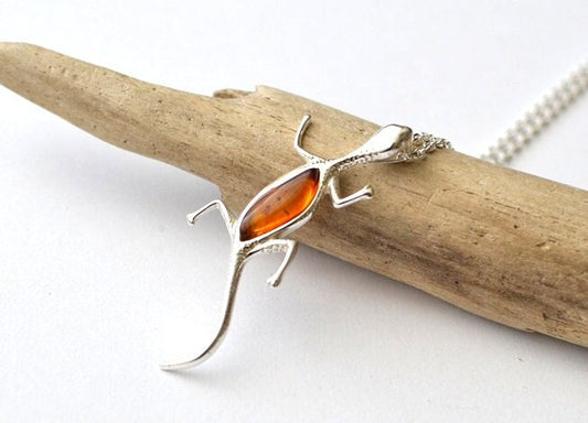 Sterling silver stone Lizard Gecko necklace, reptile jewelry amber necklace gift for her, silver chain gemstone necklace animal lover gift