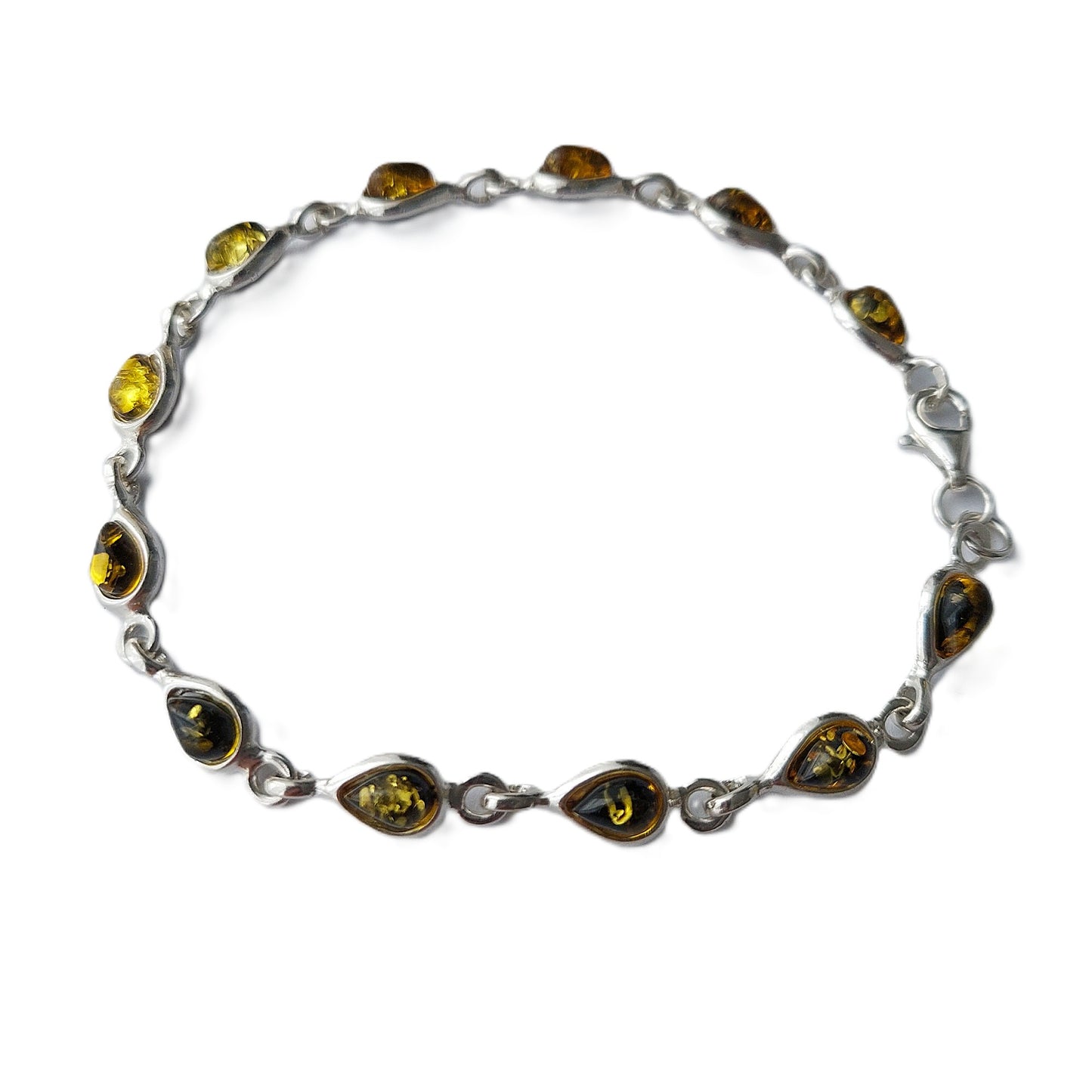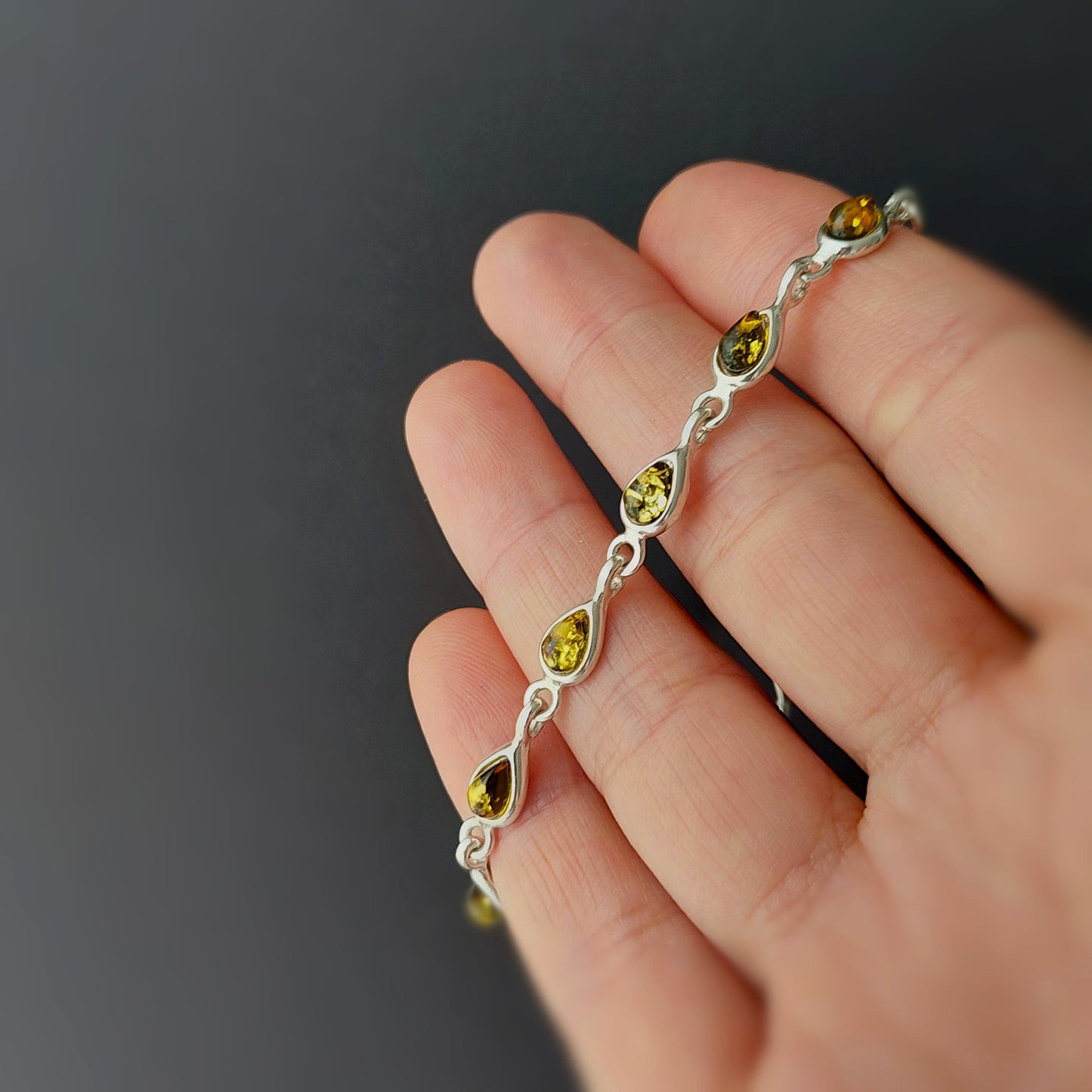 Each teardrop-shaped amber stone has its own natural character, glowing in shades of olive and gold. No two are exactly alike, making every bracelet a little one-of-a-kind gift from nature.