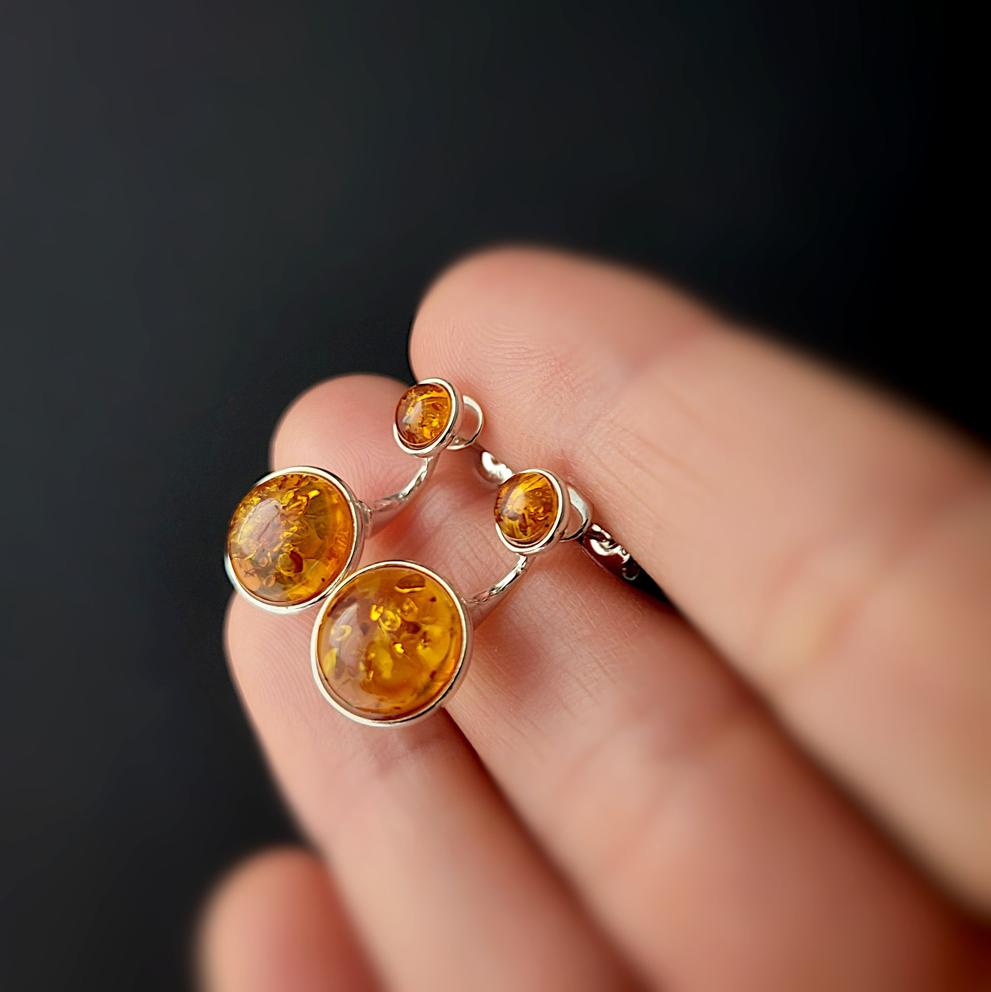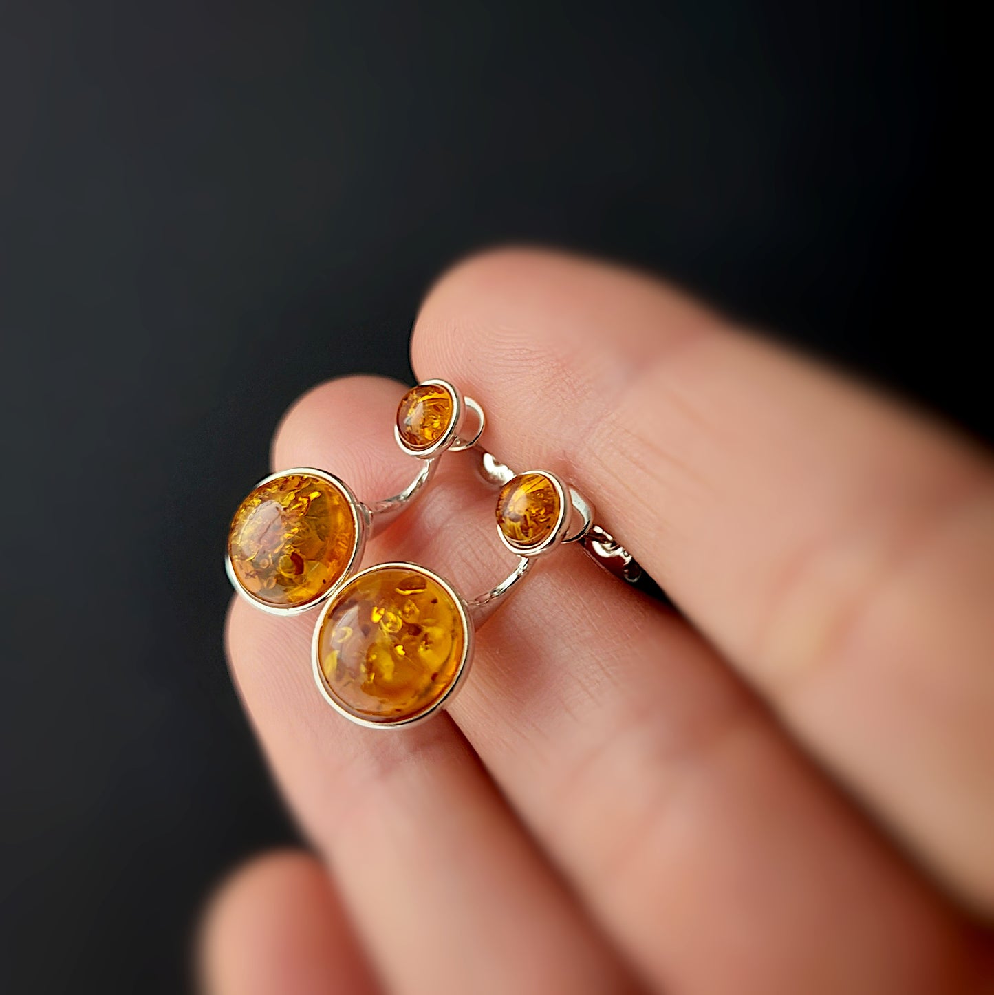 Each earring is crafted from solid 925 sterling silver and genuine Baltic amber. The clever two-part construction allows you to wear them as minimalist amber studs or as bold statement ear jackets.