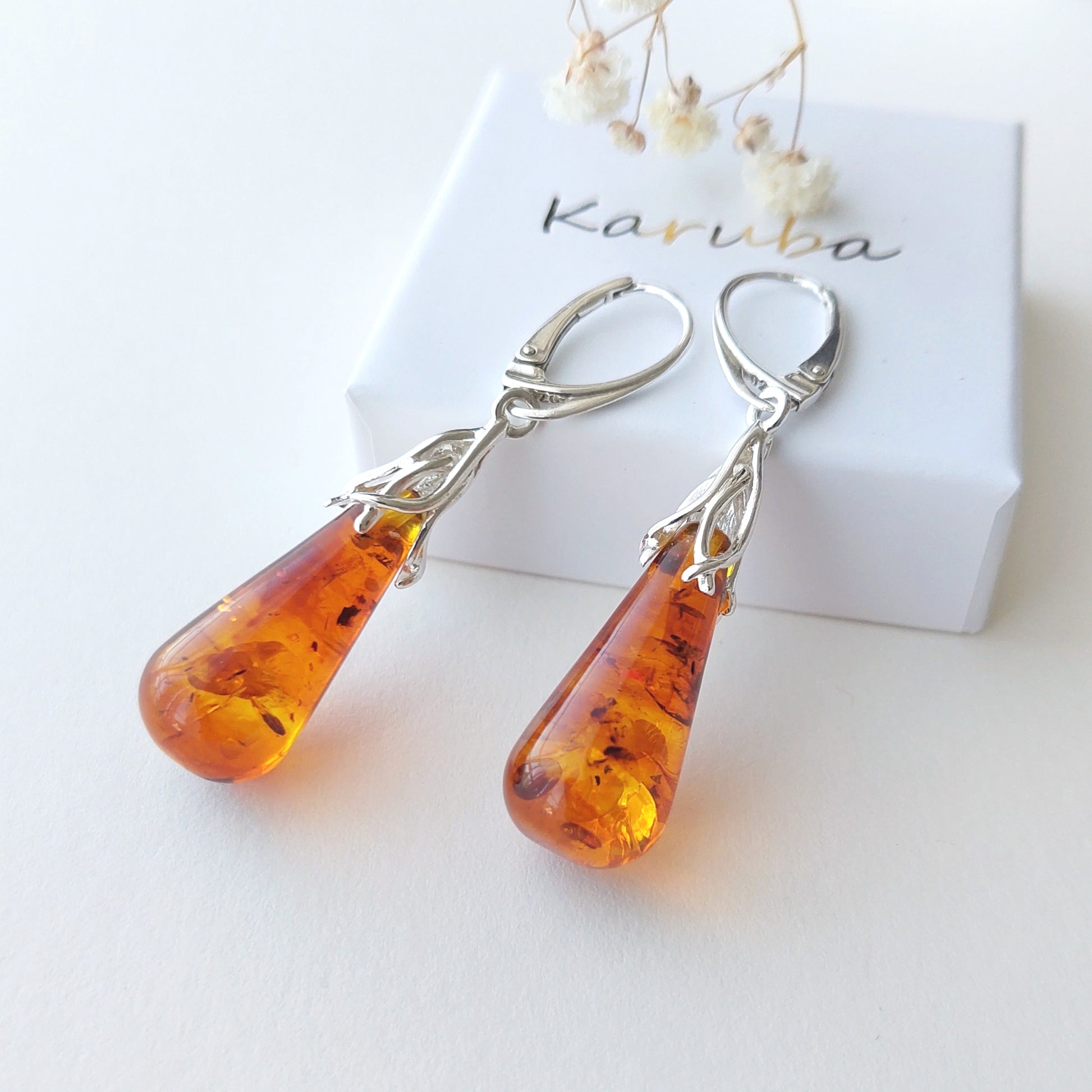 Amber Drop Earrings with Silver, Natural Baltic Amber Jewelry, Gemstone long teardrop earrings, large earrings for women gem earrings gift