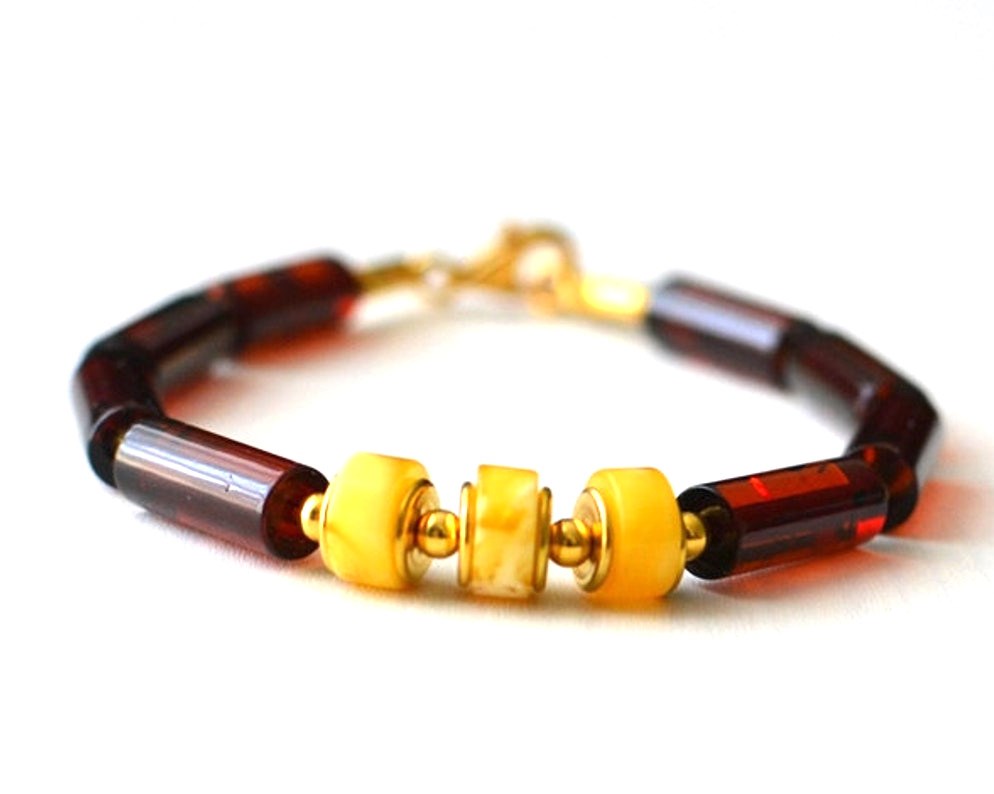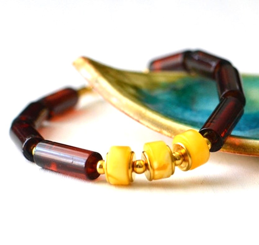 This particular nbracelet is made of natural Baltic stone and gold plated sterling silver elements (Ag 925).