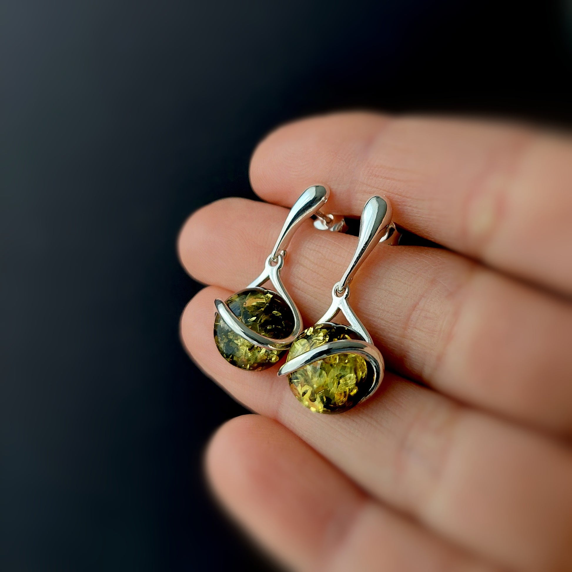 Add a touch of nature-inspired elegance to your jewelry collection with these stunning green Baltic amber drop earrings. Crafted from solid 925 sterling silver, these elegant dangle earrings feature rich green amber cabochons with beautiful natural inclusions that catch the light with every movement.