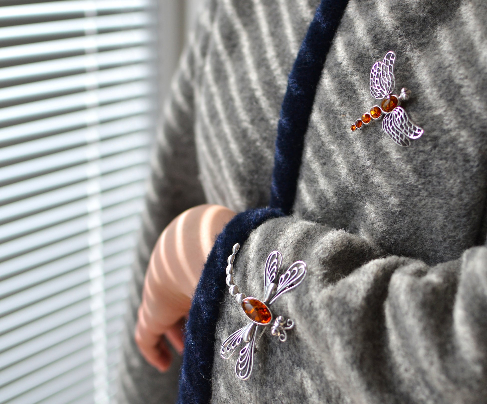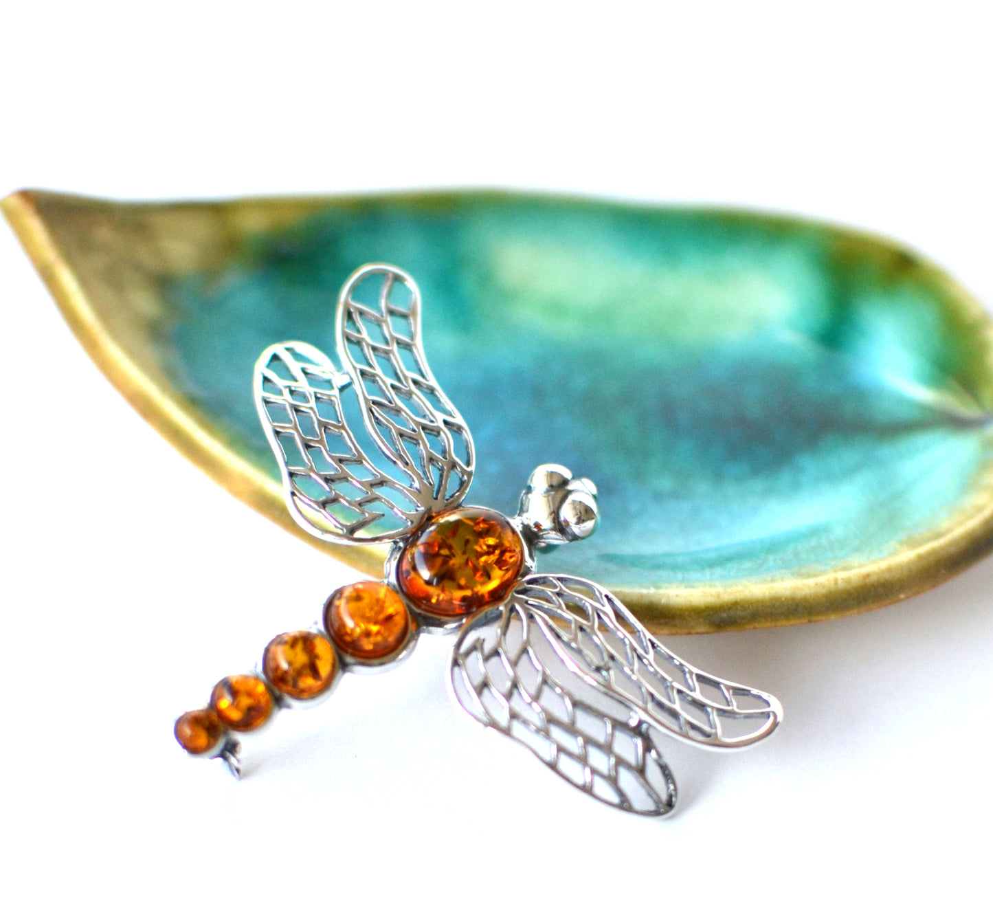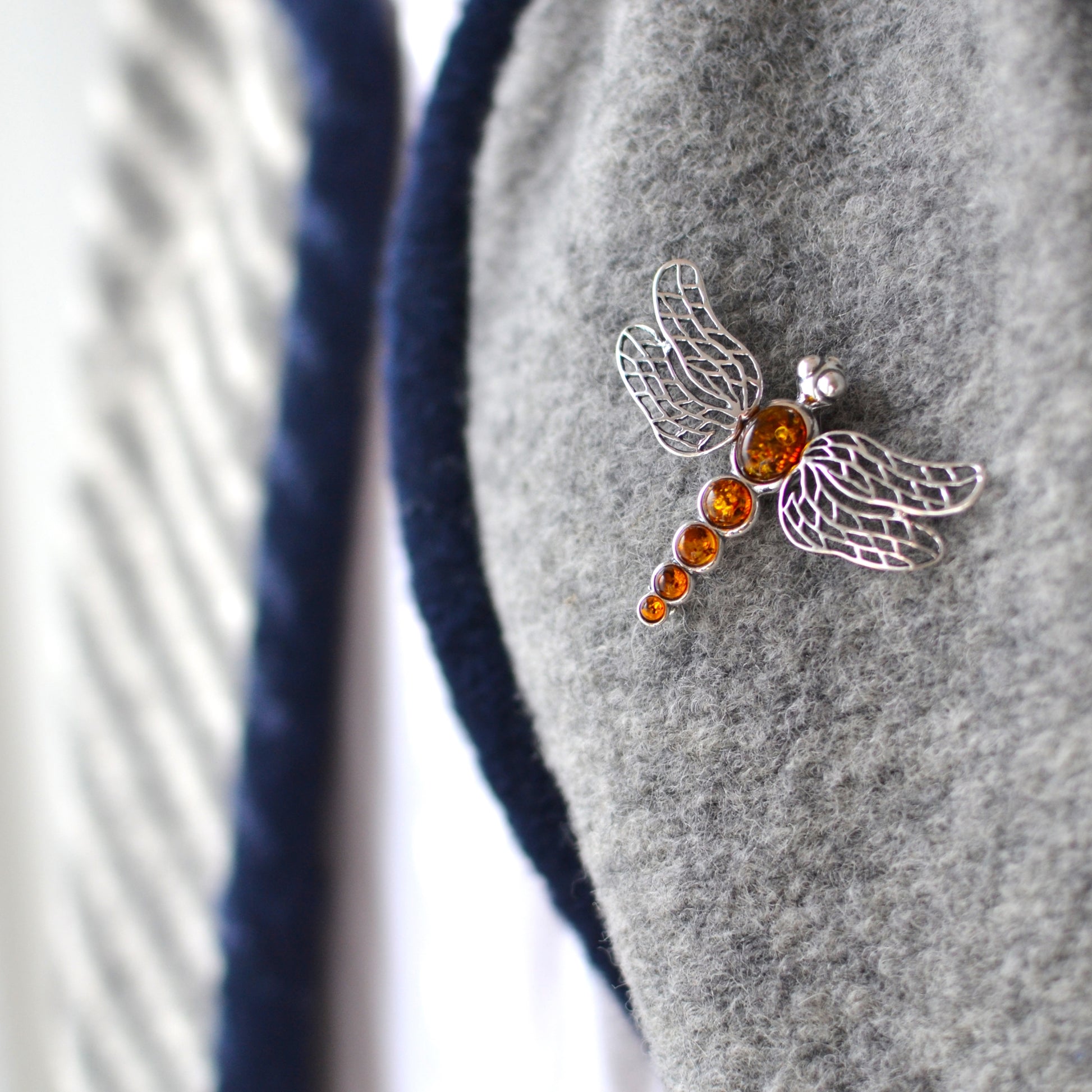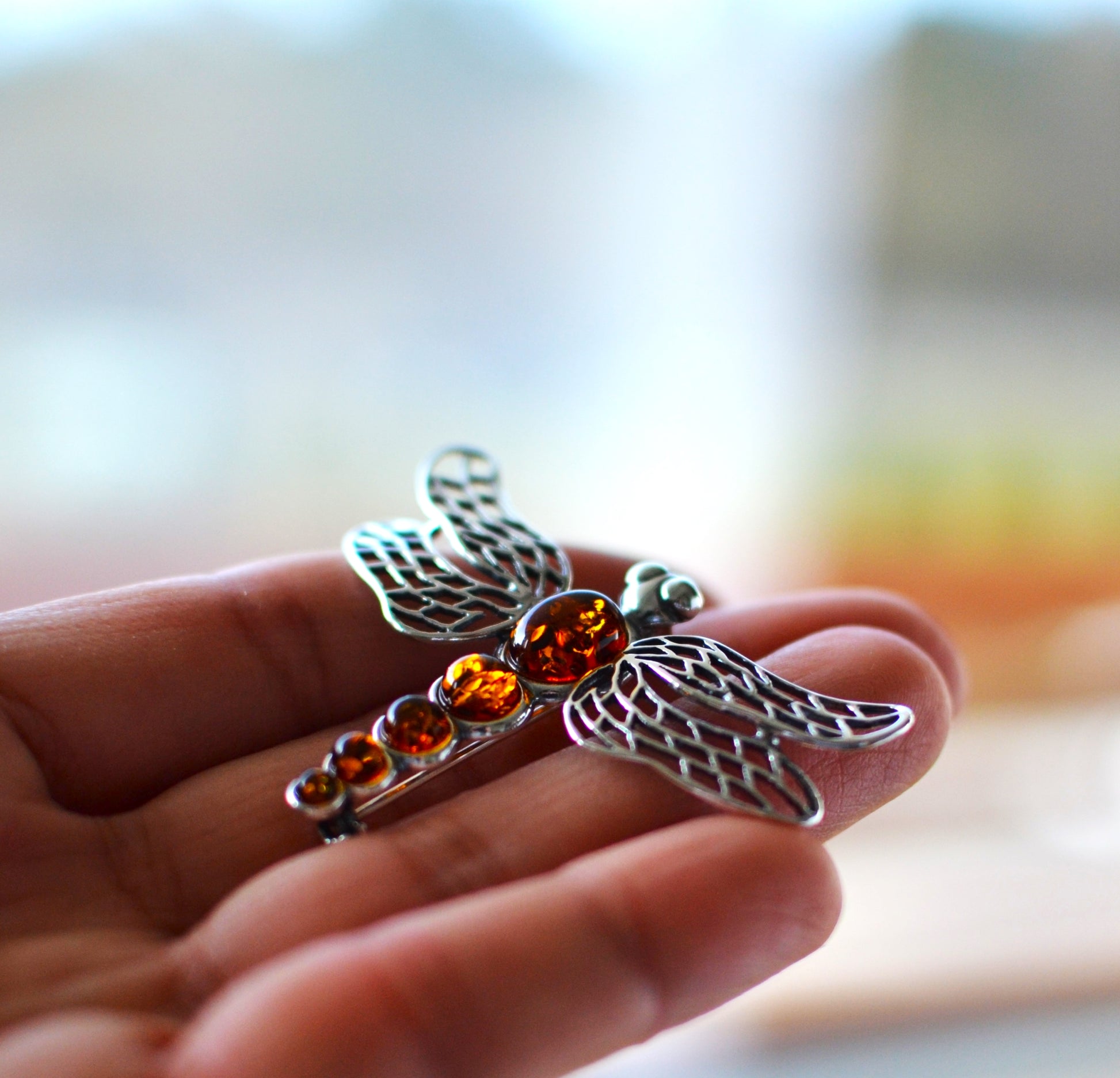 Sterling silver dragonfly brooch with amber, sterling silver amber scarf pin, insect jewelry brooch gardener gift dragonfly jewelry gifts