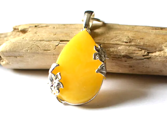 Amber is good to wear for any everyday life occasion Amber drop pendant on sterling silver snake chain (Ag 925).