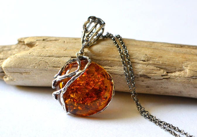 This particular pendant is made of Baltic amber and sterling silver element (Ag 925). Beautiful stone pendant with unique wonderful silver pattern Length of chain: 45 cm (17,7 ")