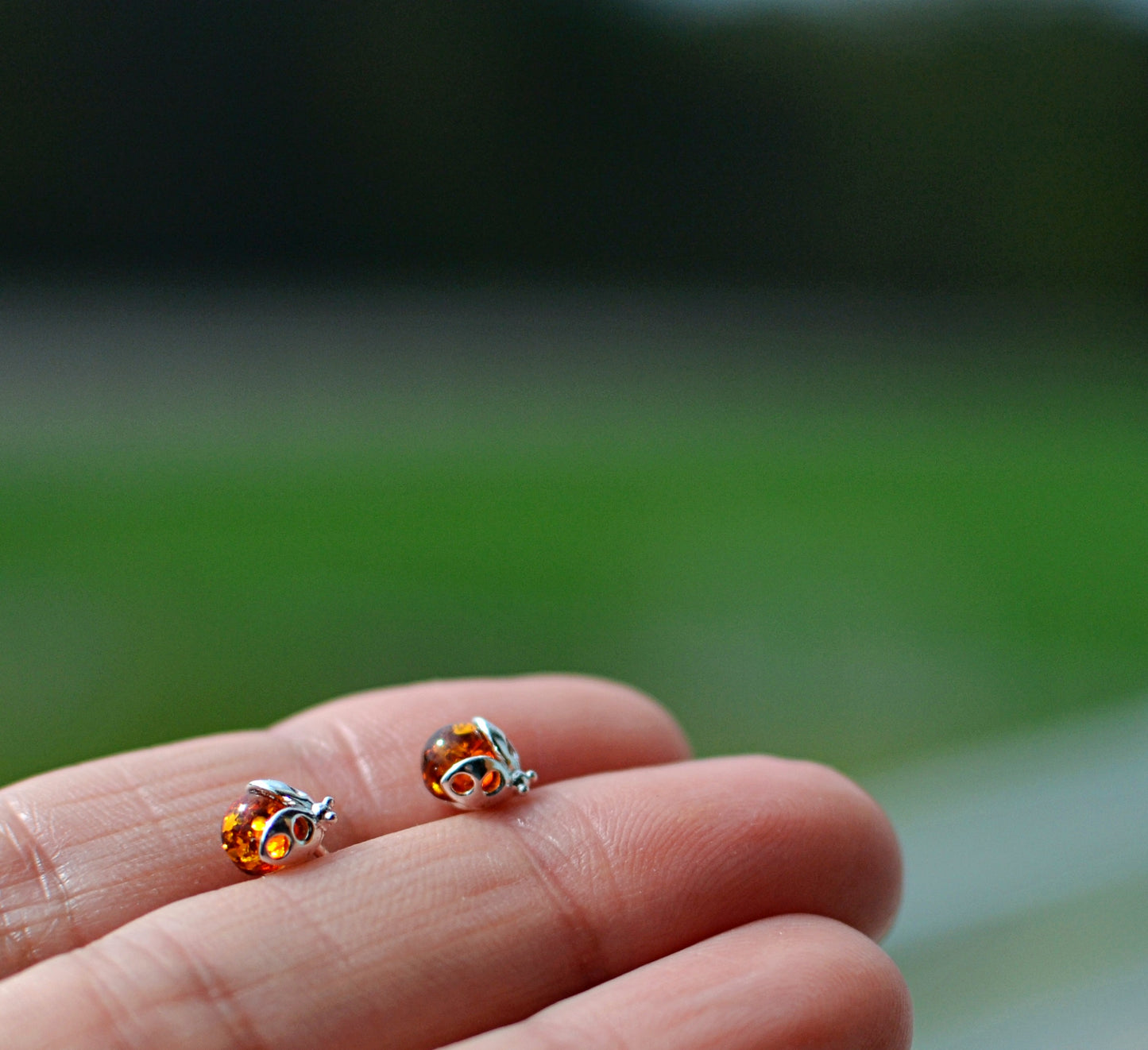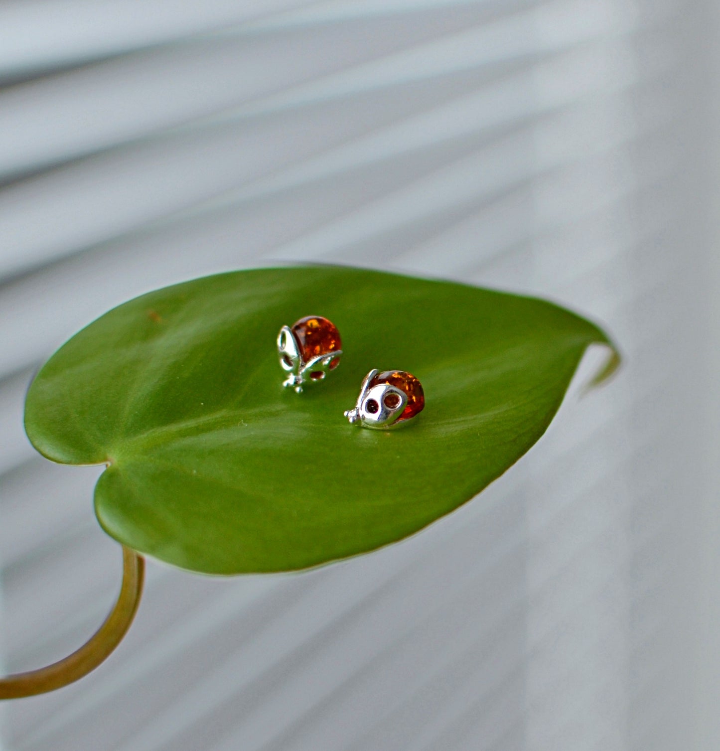 Cute Tiny Amber Ladybug stud earrings, Silver Lady bug summer stud Small sterling silver Ladybird nature earrings Amber insect earrings gift