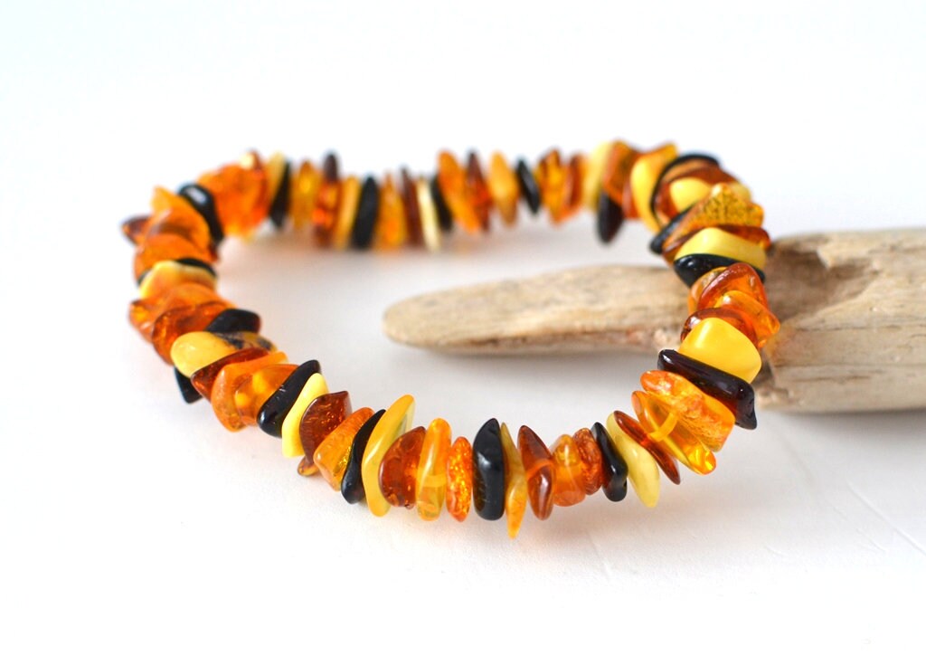 Amber beads in brown/cognac and yellow colours are placed on elastic thread
