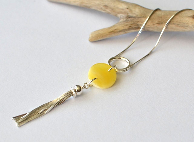 Amber Necklace, Silver Tassel Necklace, Amber Jewelry, Modern Necklace, Real stone, gift for wife, minimalist jewelry, necklace for mom This sterling silver tassel stone necklace is a stunning statement piece with a sterling silver tassel. The tassel and natural white stone disc is on a sterling silver chain. If you search for harmony, empowerment and originality offered by nature you must reach for the beautifully handcrafted stone pieces. Length of necklace: 45 cm / 17,7" Amber bead is: 11 mm (0,44") Net weight: 8 g Your necklace and bracelet will come carefully wrapped in an eco-friendly gift box. If you like to see classical beauty of stone I encourage you to visit our gallery which carries innovative and unique pieces by these Polish artists who often incorporate other exciting elements in their raw and natural form please visit our gallery http://www.karuba.eu Thank you for visiting our shop: http://www.etsy.com/shop/KARUBA