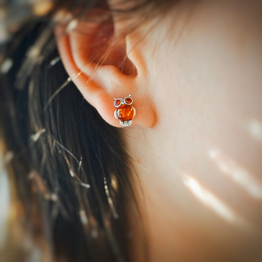 Gold Plated Silver Owl Earrings, Baltic Amber Studs 925