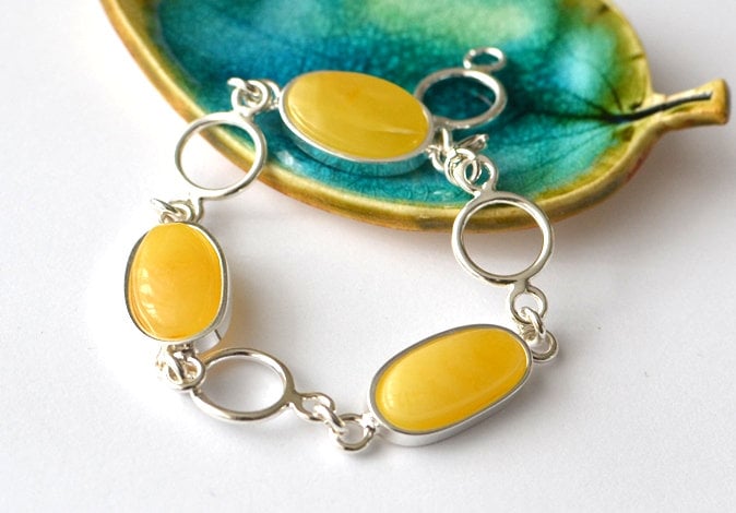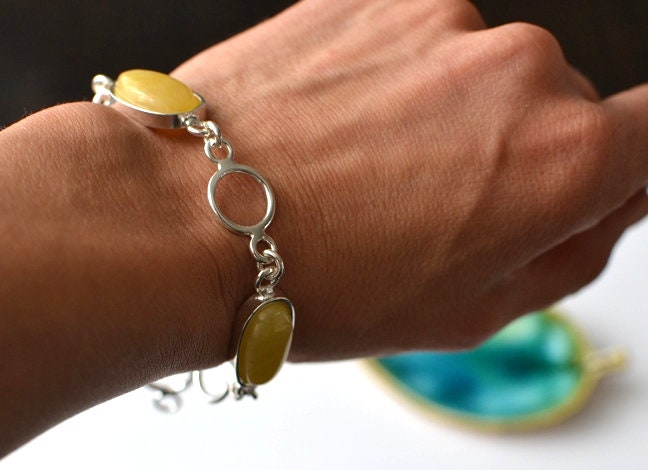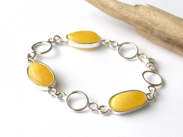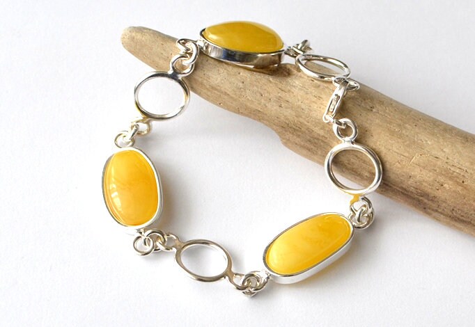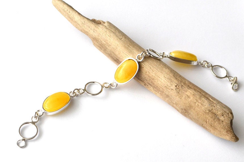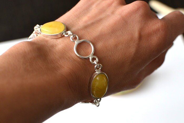 Natural Amber Sterling Silver Bracelet, Untreated Amber Bracelet, Amber Jewelry, Egg Yolk Amber Bracelet, Handmade stone chain bracelet Exclusive natural Baltic Amber bracelet This particular bracelet is made of natural baltic stone and sterling silver (Ag 925) elements Just simple elegant bracelet! Length of the barcelet: 22cm / 8.6" - adjustable size Amber beads size about: 20x12 mm (0,78x0,47") Net weight: 20.3 g Your bracelet will come carefully wrapped in an eco-friendly gift box. If you search for harmony, empowerment and originality offered by nature you must reach for the beautifully handcrafted stone pieces. If you like to see classical beauty of stone I encourage you to visit our gallery which carries innovative and unique pieces by these Polish artists who often incorporate other exciting elements in their raw and natural form. Please visit our gallery www.karuba.eu Thank you for visiting my shop: http://www.etsy.com/shop/KARUBA