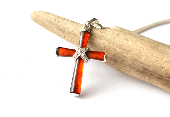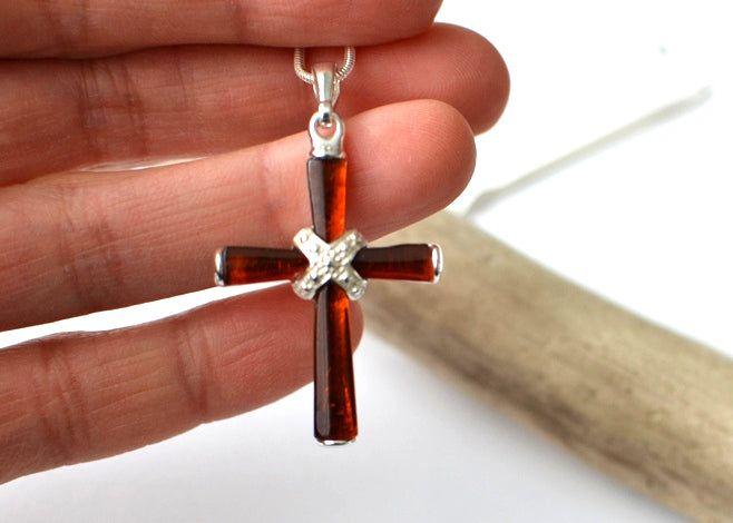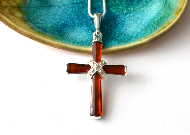 Cross Amber Pendant Necklace - Cross Gift, Catholic jewelry, Religious Necklace