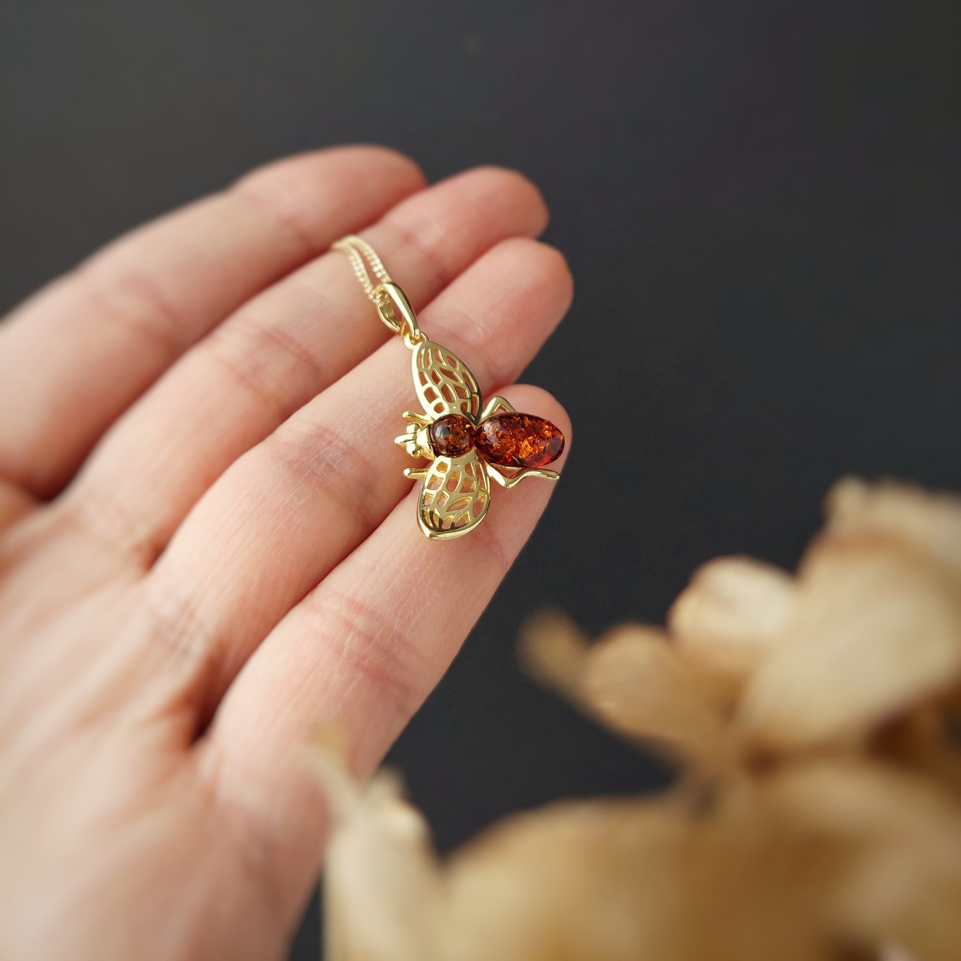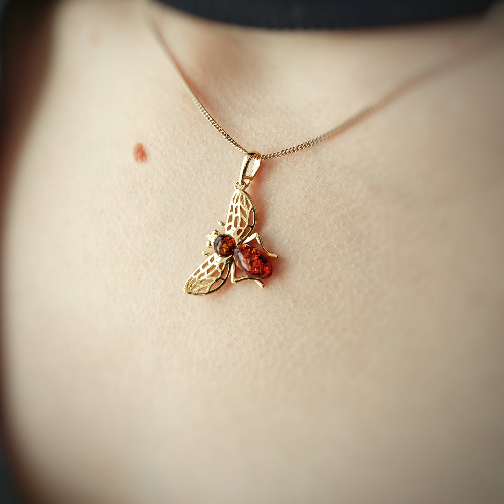 Sterling Silver and 24c Gold Plate amber bee pendant necklace in beautiful cognac colour. Amber is good to wear for any everyday life occasion - modern bee jewelry