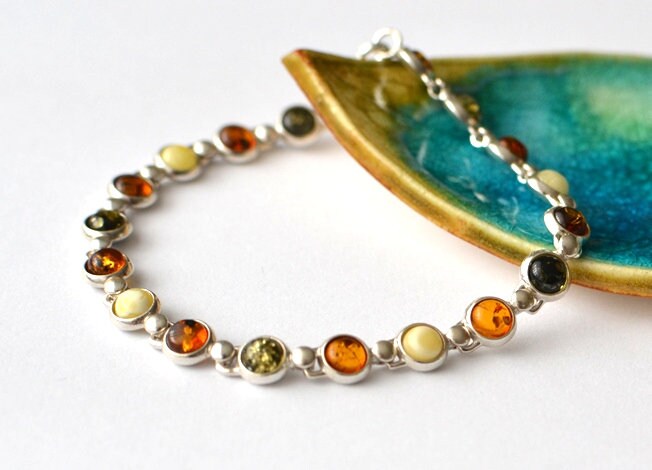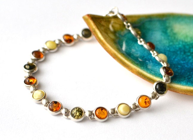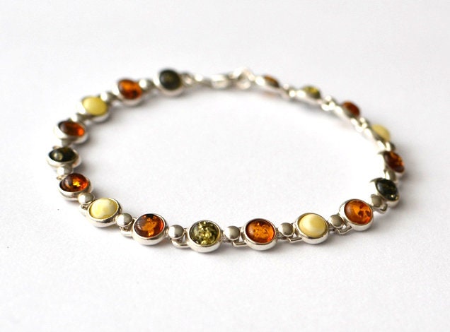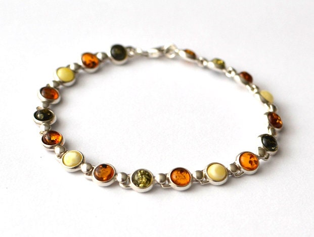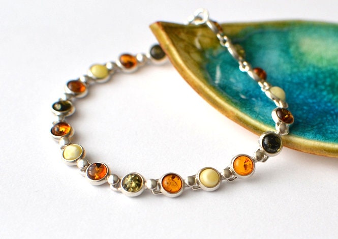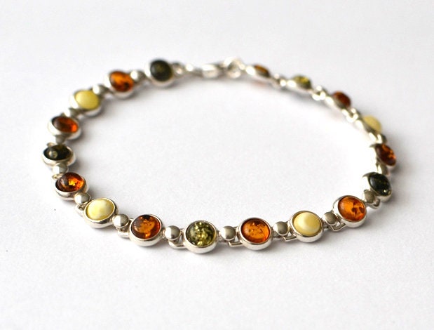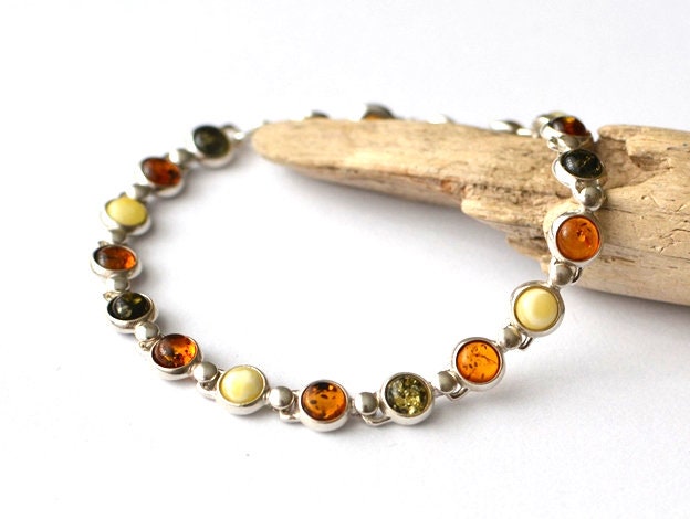 Amber Bracelet, silver link bracelet, Minimalist jewelry, dainty gemstone bracelet, chain bracelet, nature stone bracelet stone jewelry gift Exclusive natural Baltic Amber bracelet This particular bracelet is made of baltic stone and sterling silver (Ag 925) elements. Multicoloured stone link bracelet: honey, green and cognac stone in the drop shapes. Just simple elegant bracelet! Materials: 925 Sterling Silver & 100% Natural Baltic Amber Length of the barcelet: 19cm / 7,5" - fits wrist 18/19 cm - 7/7,5" Amber beads size about: 5mm (0,19") Net weight: 9.2 g Your bracelet will come carefully wrapped in an eco-friendly gift box. If you search for harmony, empowerment and originality offered by nature you must reach for the beautifully handcrafted stone pieces. If you like to see classical beauty of stone I encourage you to visit our gallery which carries innovative and unique pieces by these Polish artists who often incorporate other exciting elements in their raw and natural form. Please visit our gallery www.karuba.eu Thank you for visiting my shop: http://www.etsy.com/shop/KARUBA