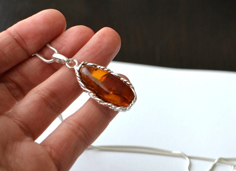 This particular pendant is made of 100% natural Baltic amber and sterling silver (Ag 925) on sterling silver thin snake chain (Ag 925).