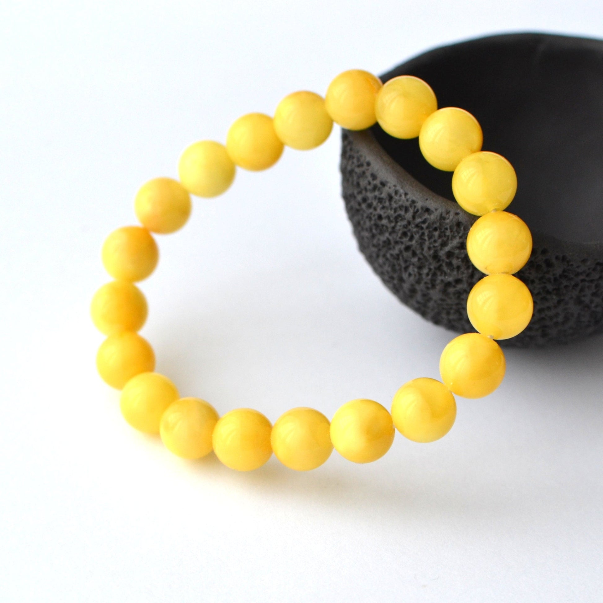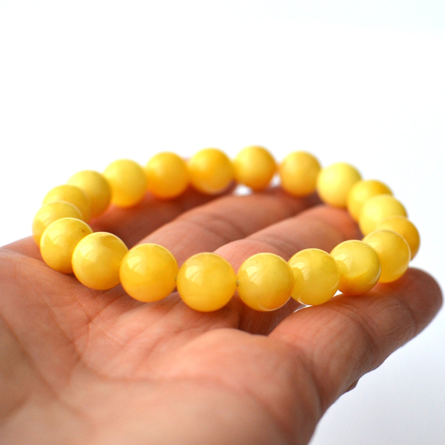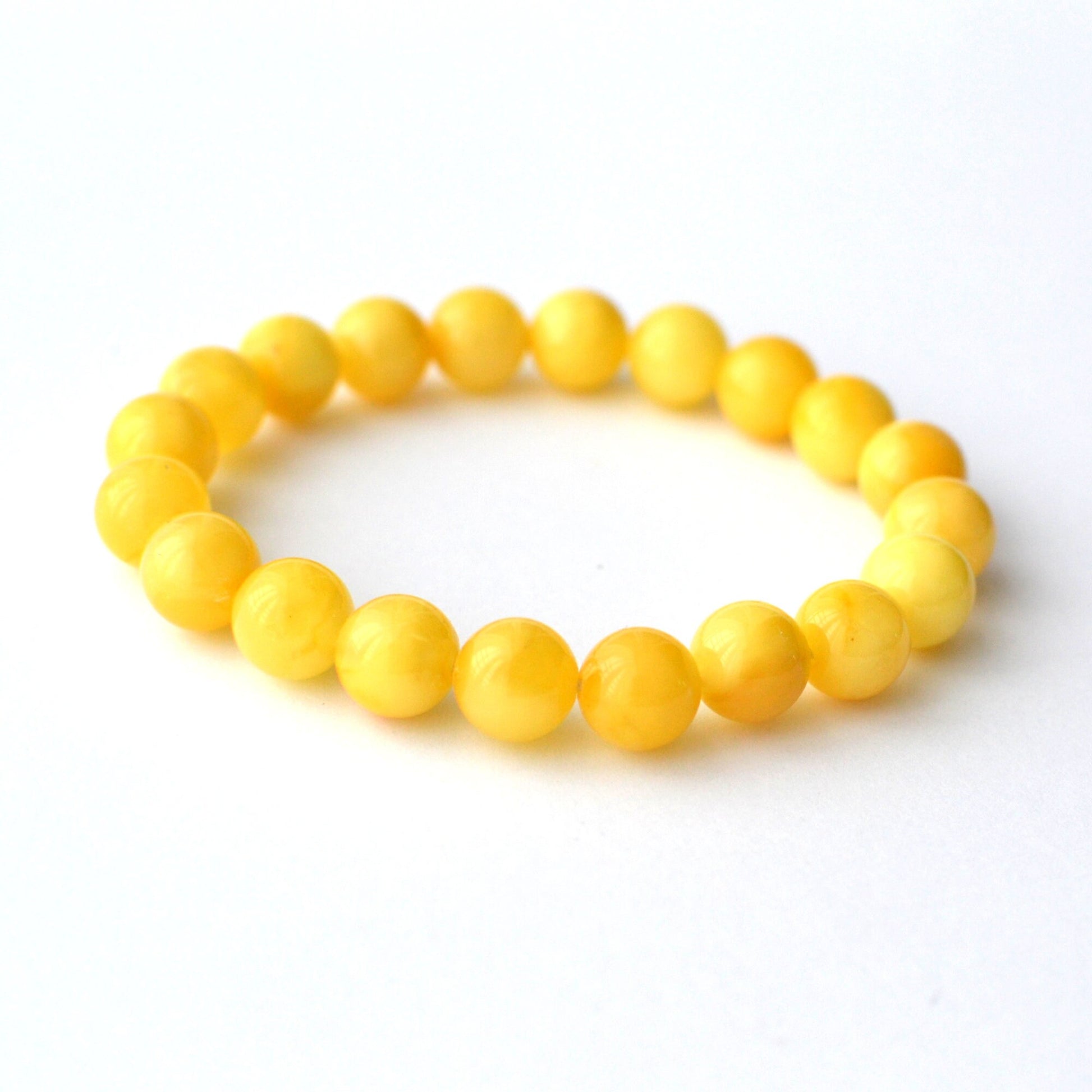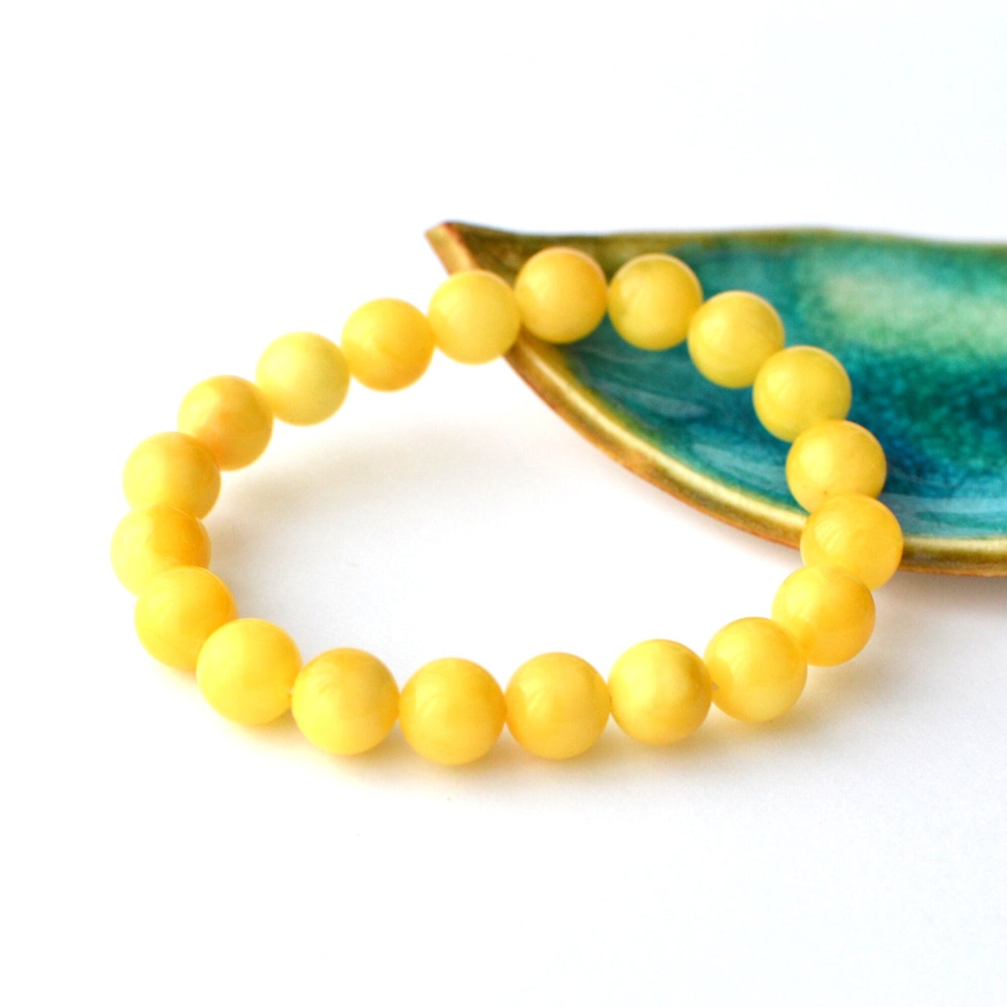 Baltic Amber Bracelet healing stone jewelry, gift for wife Anxiety Bracelet, Stress Relief Bracelet Gift, Calming Energy Meditation Bracelet This particular bracelet is made yellow baltic stone. Amber stretch bracelet - stones are assembled on rubber string. Just simple elegant bracelet! Amber fossil jewelry Length about: 17/18 cm - 6,7/7,1" Amber beads are about: 9.8 mm / (0.39") Net weight: 10.5 g According to the International Amber Association they are classified as: "Modified Baltic stone (Succinite). – gemstone subject only to thermal or high-pressure treatment, which changed its physical properties, including the degree of transparency and color. Your bracelet will come carefully wrapped in an eco-friendly gift box. Baltic stone, also known as, succinate is a fossilized resin originating from the extinct conifer species, which over 40 million years ago was part of a vast forest growing at the place where the Baltic Sea now lies. Unlike other fossil resins, it contains between 3-8 percent of stone acid, which is believed to have healing and nurturing properties. Due to the presence of succinic acid, Baltic stone acts as a biostimulator. It stimulates the nervous system, regulates the kidney and intestinal function, is an anti-inflammatory and anti-toxic agent. It is called the stone of life, because it can provide the body with life-giving electrons and negative ions, which increase the body’s ability to self-heal, and it strengthens the body’s immune system. Throughout the centuries, many legends have arisen around stone. The ancient Chinese believed that the soul of a tiger lays enchanted in stone - the eyes of a tiger have the colour of stone. Gladiators carried pieces of stone with them, which they believed ensured their victory in battles. And the women of Ancient Rome believed that contact with stone provided a young and fresh appearance. If you search for harmony, empowerment and originality offered by nature you must reach for the beautifully handcrafted stone pieces. Thank you for visiting our shop: http://www.etsy.com/shop/KARUBA