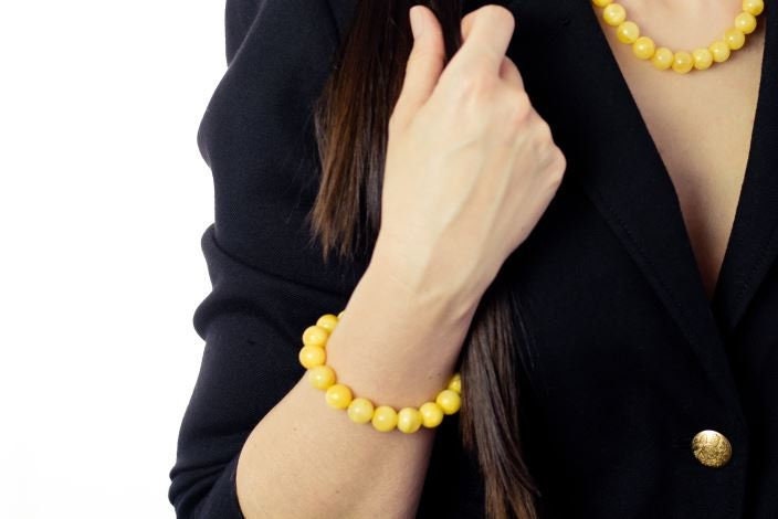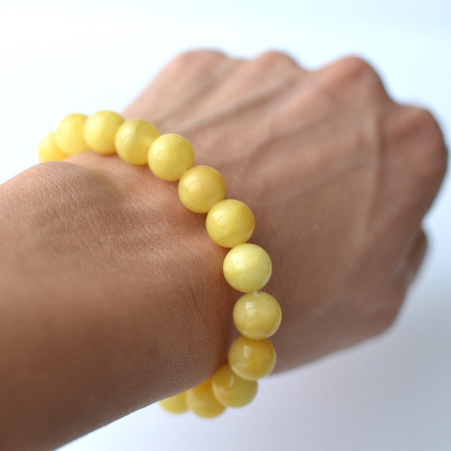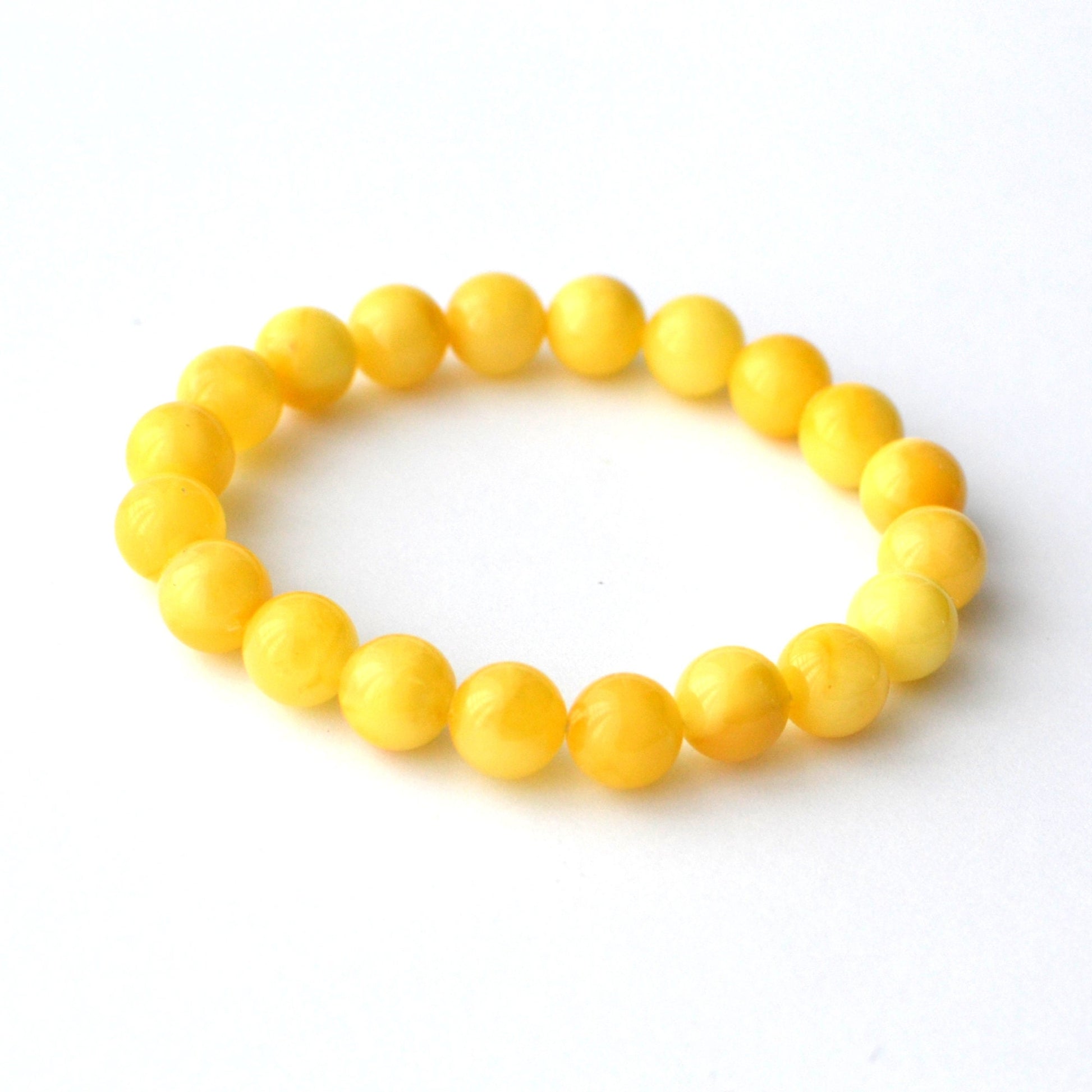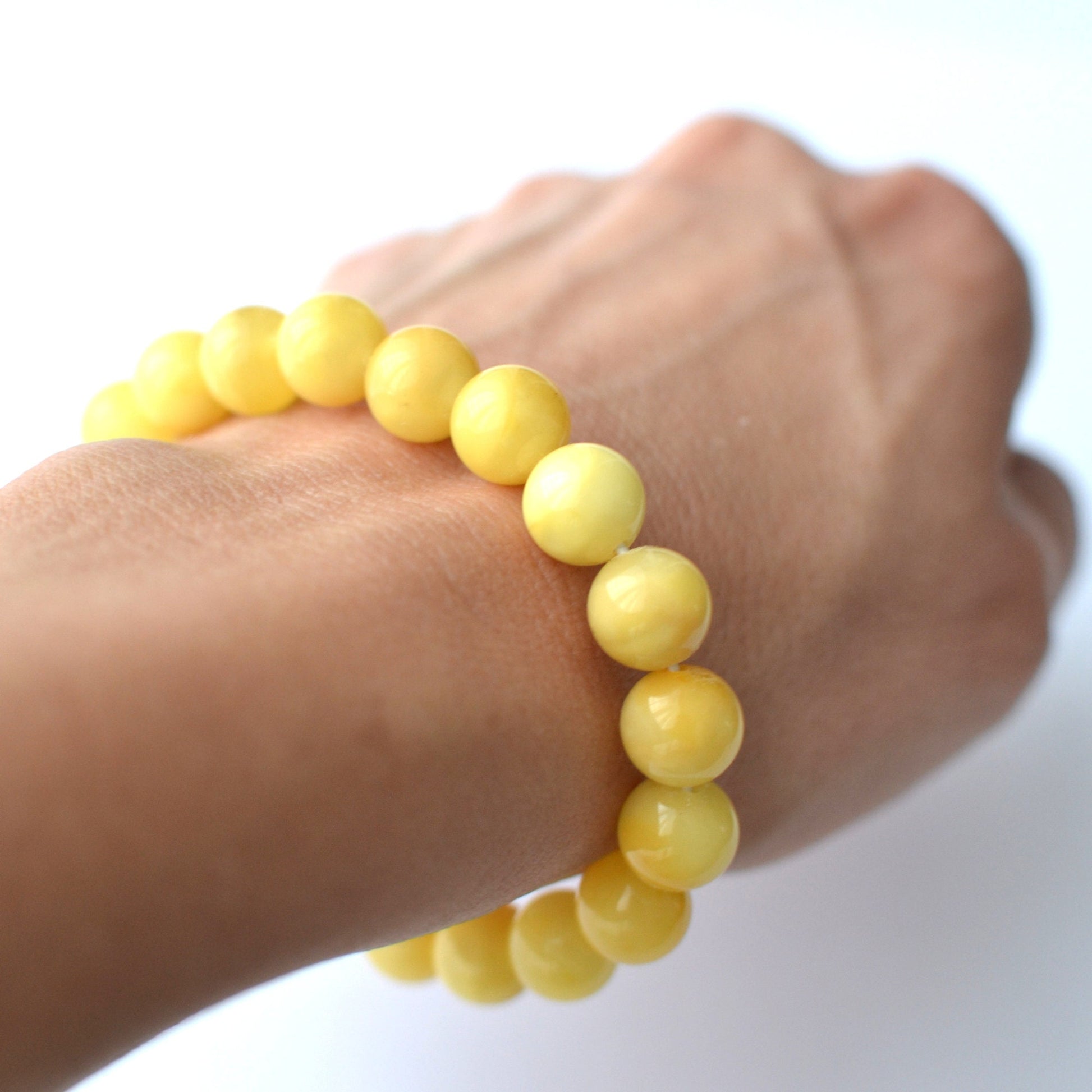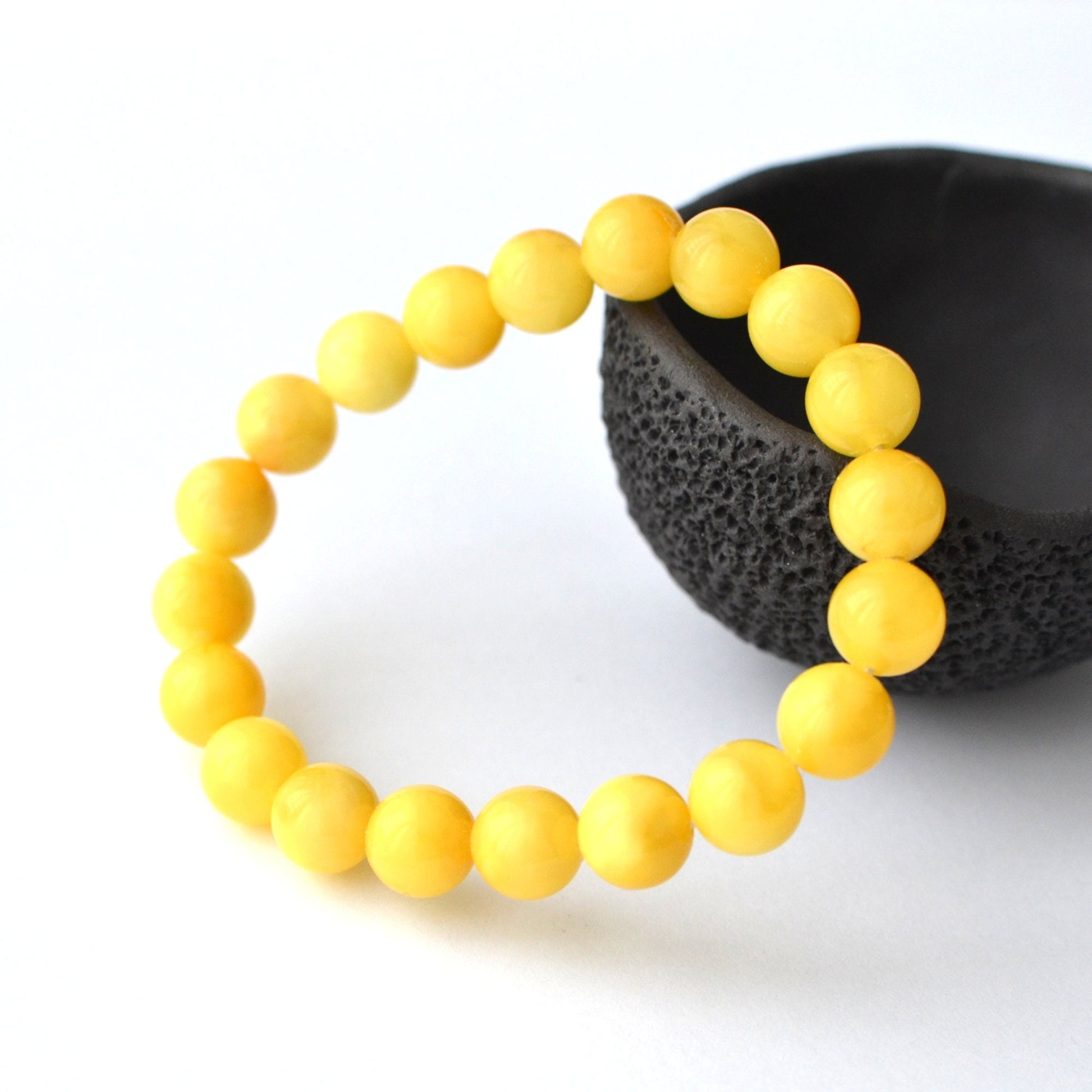 Baltic Amber Bracelet healing stone jewelry, gift for wife Anxiety Bracelet, Stress Relief Bracelet Gift, Calming Energy Meditation Bracelet This particular bracelet is made yellow baltic stone. Amber stretch bracelet - stones are assembled on rubber string. Just simple elegant bracelet! Amber fossil jewelry Length about: 17/18 cm - 6,7/7,1" Amber beads are about: 9.8 mm / (0.39") Net weight: 10.5 g According to the International Amber Association they are classified as: "Modified Baltic stone (Succinite). – gemstone subject only to thermal or high-pressure treatment, which changed its physical properties, including the degree of transparency and color. Your bracelet will come carefully wrapped in an eco-friendly gift box. Baltic stone, also known as, succinate is a fossilized resin originating from the extinct conifer species, which over 40 million years ago was part of a vast forest growing at the place where the Baltic Sea now lies. Unlike other fossil resins, it contains between 3-8 percent of stone acid, which is believed to have healing and nurturing properties. Due to the presence of succinic acid, Baltic stone acts as a biostimulator. It stimulates the nervous system, regulates the kidney and intestinal function, is an anti-inflammatory and anti-toxic agent. It is called the stone of life, because it can provide the body with life-giving electrons and negative ions, which increase the body’s ability to self-heal, and it strengthens the body’s immune system. Throughout the centuries, many legends have arisen around stone. The ancient Chinese believed that the soul of a tiger lays enchanted in stone - the eyes of a tiger have the colour of stone. Gladiators carried pieces of stone with them, which they believed ensured their victory in battles. And the women of Ancient Rome believed that contact with stone provided a young and fresh appearance. If you search for harmony, empowerment and originality offered by nature you must reach for the beautifully handcrafted stone pieces. Thank you for visiting our shop: http://www.etsy.com/shop/KARUBA