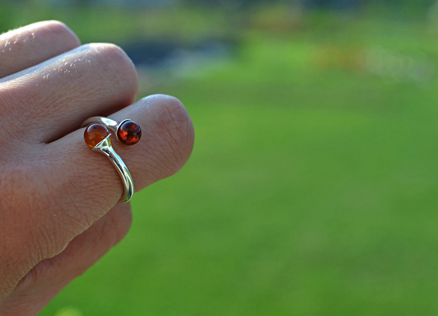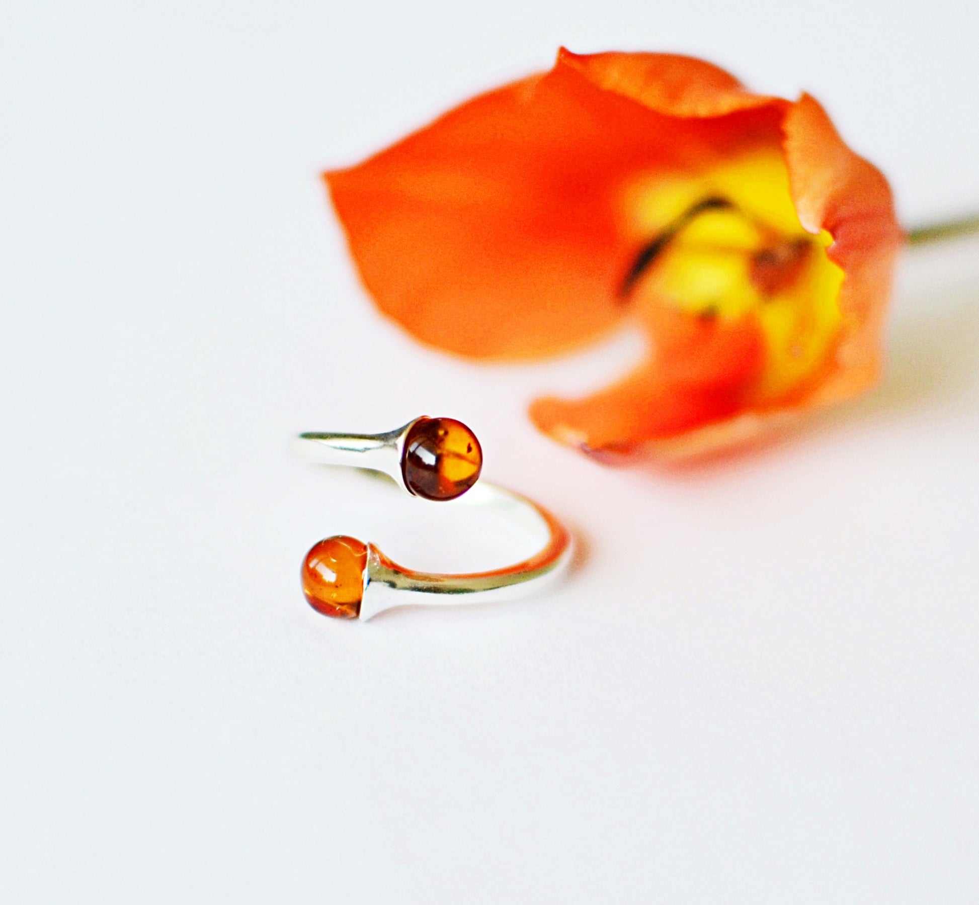 Add warmth and elegance to your jewelry collection with this modern open ring crafted from genuine Baltic amber and 925 sterling silver. Featuring two smooth amber spheres in a stunning cognac shade, this minimalist design offers timeless appeal and everyday versatility.
