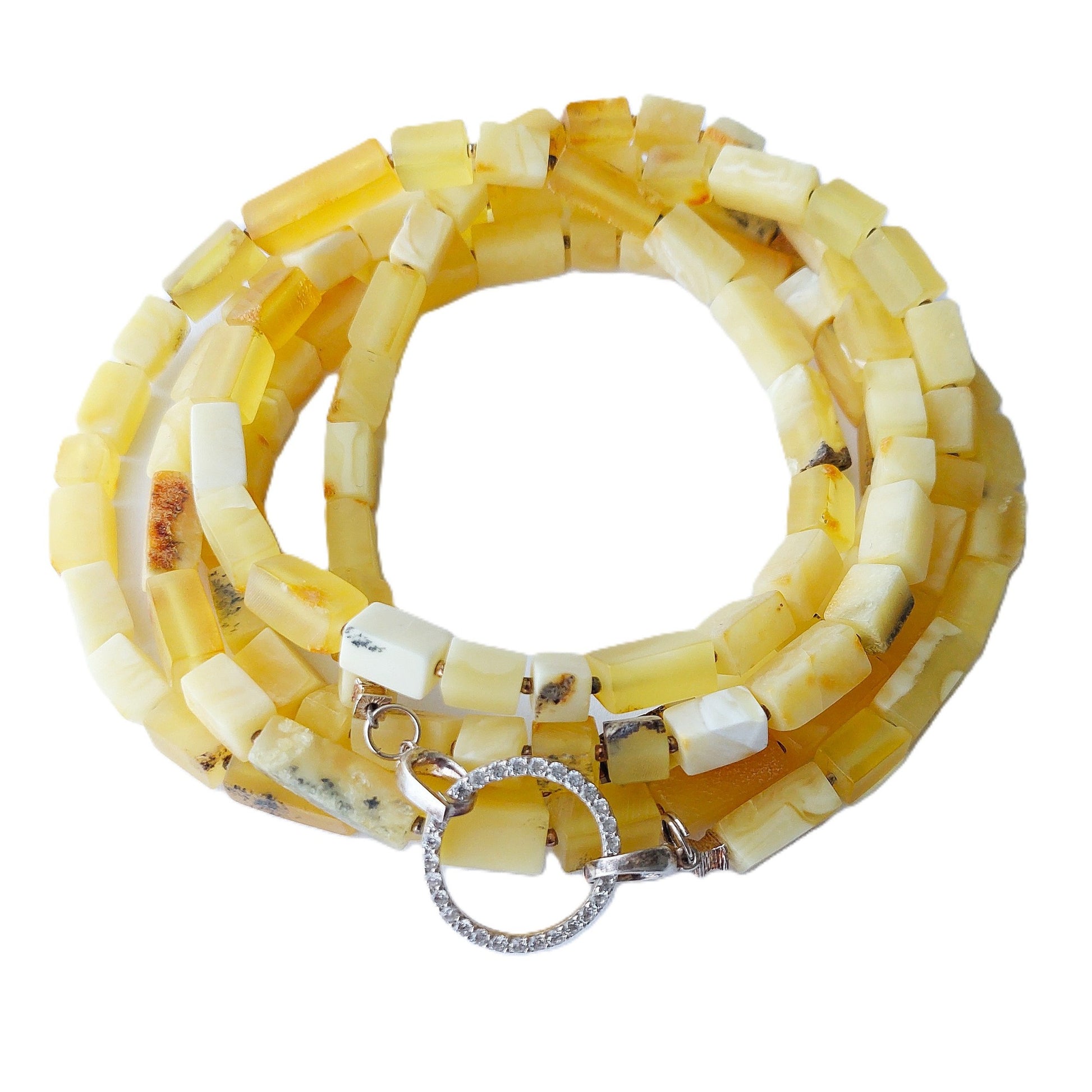 A unique necklace made entirely from natural, matte yellow amber. The amber used in this jewelry has a geometric shape, giving it a modern, minimalist character, perfectly combining tradition with contemporary design. The necklace has an impressive length of 160 cm, allowing it to be worn in multiple ways – wrapped around the neck 2, 3, or even 4 times, creating a different effect each time, from elegant to casual.Necklace Features: