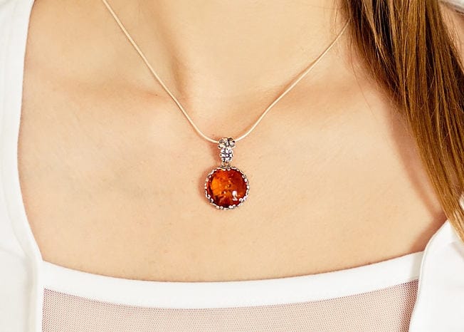 This particular pendant is made of Baltic amber and sterling silver element (Ag 925).